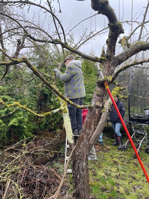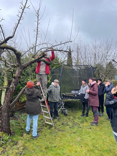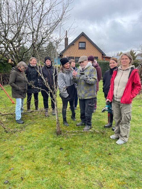 Acht Gartenfreundinnen waren mit dabei. Sie konnten Vorschläge für den Obstbaumschnitt machen, damit der Apfelbaum dieses Jahr wieder ordentlich Äpfel trägt.